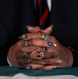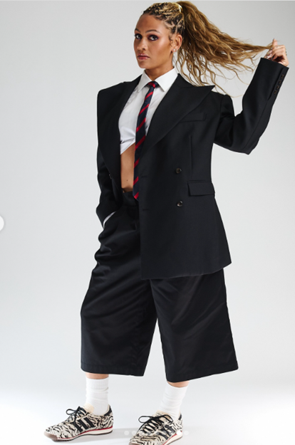 Details on Rodman’s look include a double-breasted short suit by Willy Chavarria, Adidas Women's SL 72 OG Zebra Off White/Core Black/Better Scarlett trainers, an easter egg filled nail set by Tanya Pantoja , hair by Mitchell Cantrell, and make-up by SirJohn. Each contributor shared how honored they felt to help shape a look that complemented the historic significance of Rodman’s signing—for her, for Black women, and for women’s soccer as a whole. When asked about her style choices for this special day, Rodman shared,“It feels like I’m reaching different audiences, different people, different cultures, all in one. I’m tapping into more realms of fashion even if I’m uncomfortable, and it’s so funny because what makes me most uncomfortable is dressing professional, so I have to make sure there’s a part of it that’s all Trinity.”